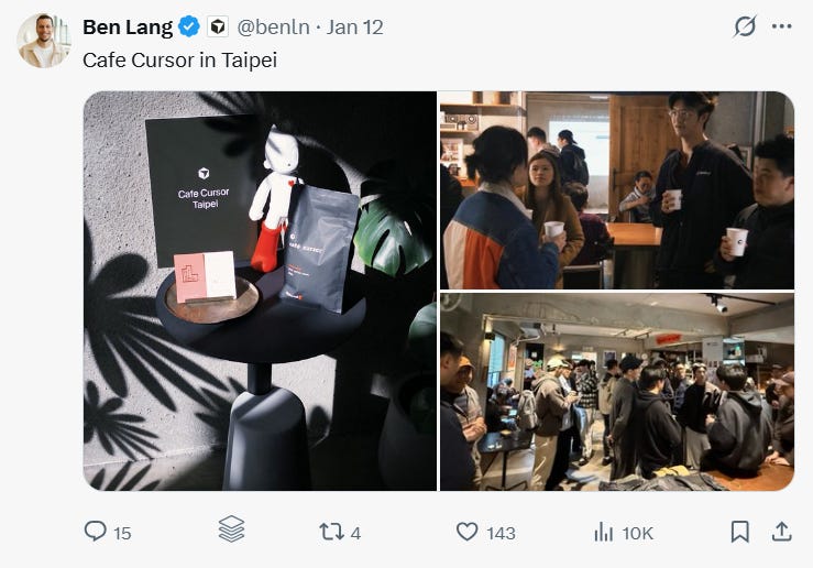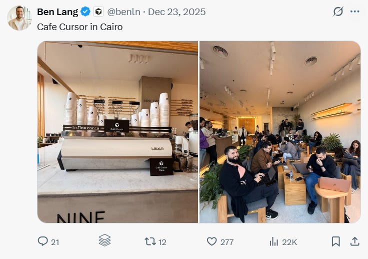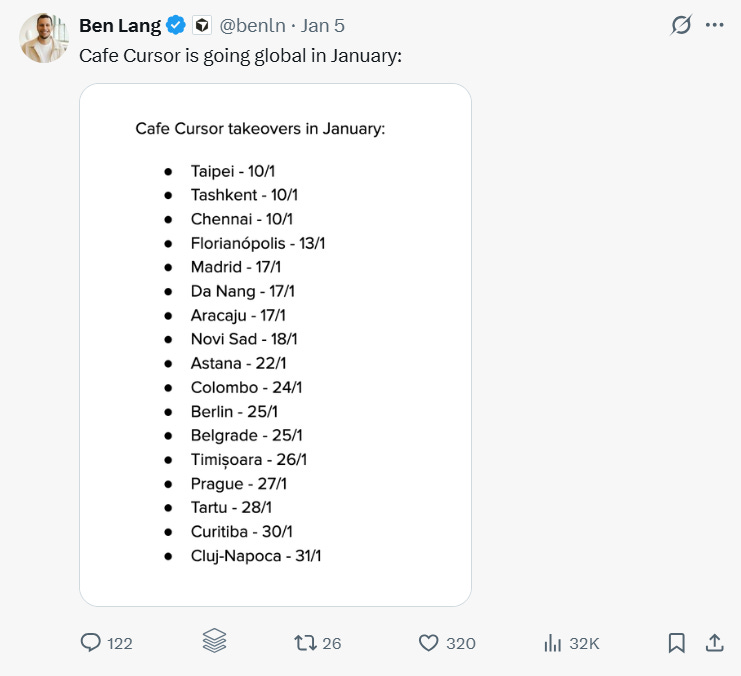 According to Ben’s X account, Cursor has been “taking over” cafes in dozens of cities from Caira, Madrid, Chiang Mai to Berlin, Prague and Taipai.