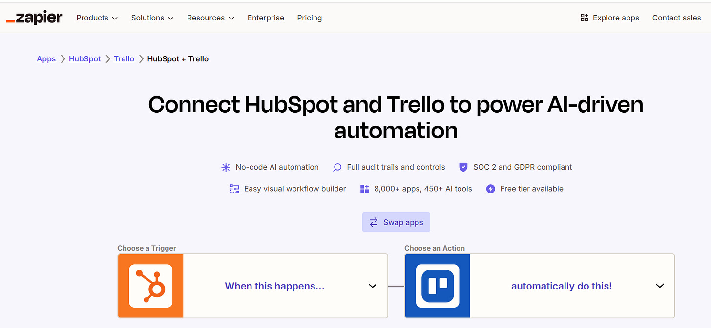 Below are screenshots showing Zapier’s landing page that appears in the result page for the search phrase, “how to connect Hubspot to Trello”.