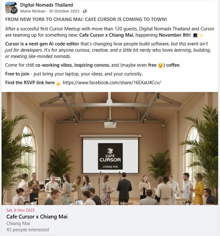 Below is a great example of how Cursor partnered with the Digital Nomads Thailand Facebook group to promote their Chiang Mai Cafe Cursor meetup.