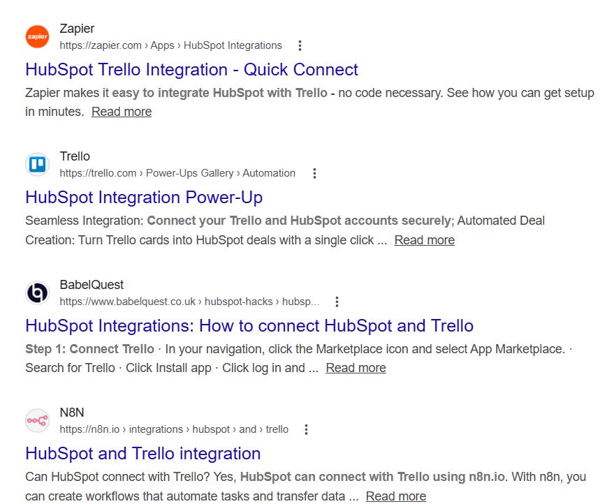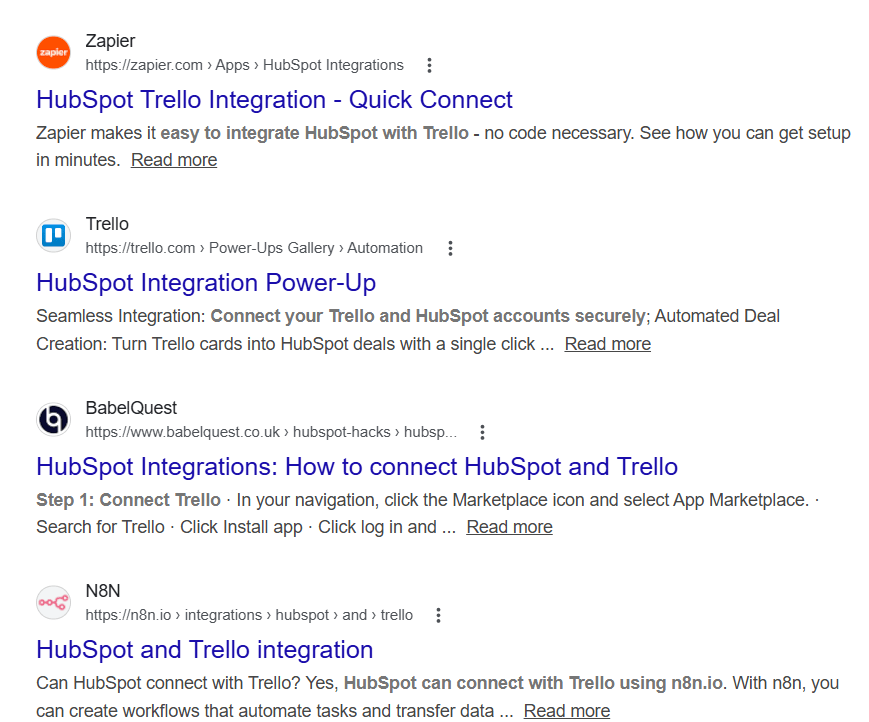 If you run a Google search for “how to connect Hubspot to Trello” and scroll through the first page results you’ll notice something interesting.