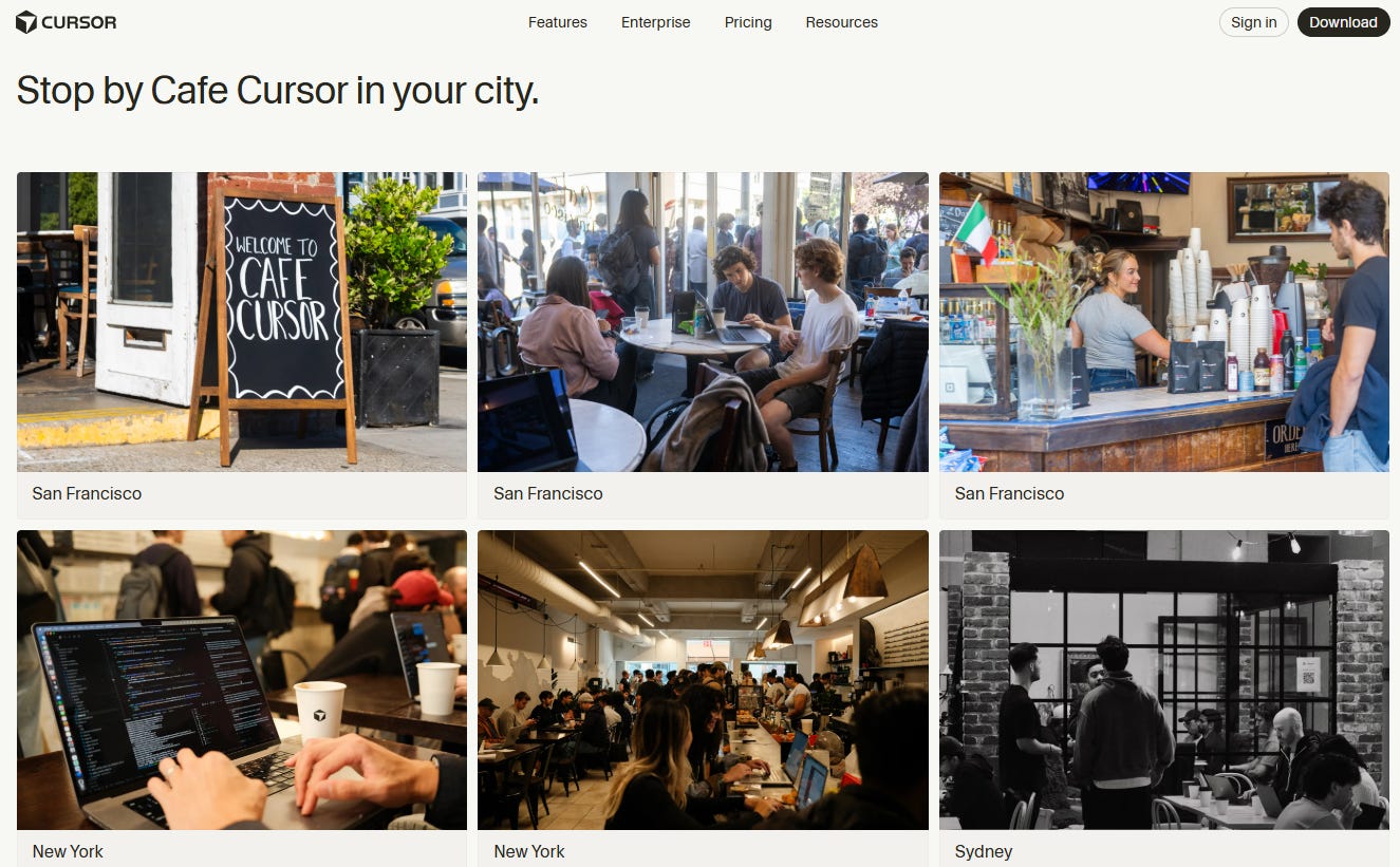 We can see on Cursor’s website that Cafe Cursor isn’t a one-off marketing initiative but rather a key piece of their community-driven marketing strategy.