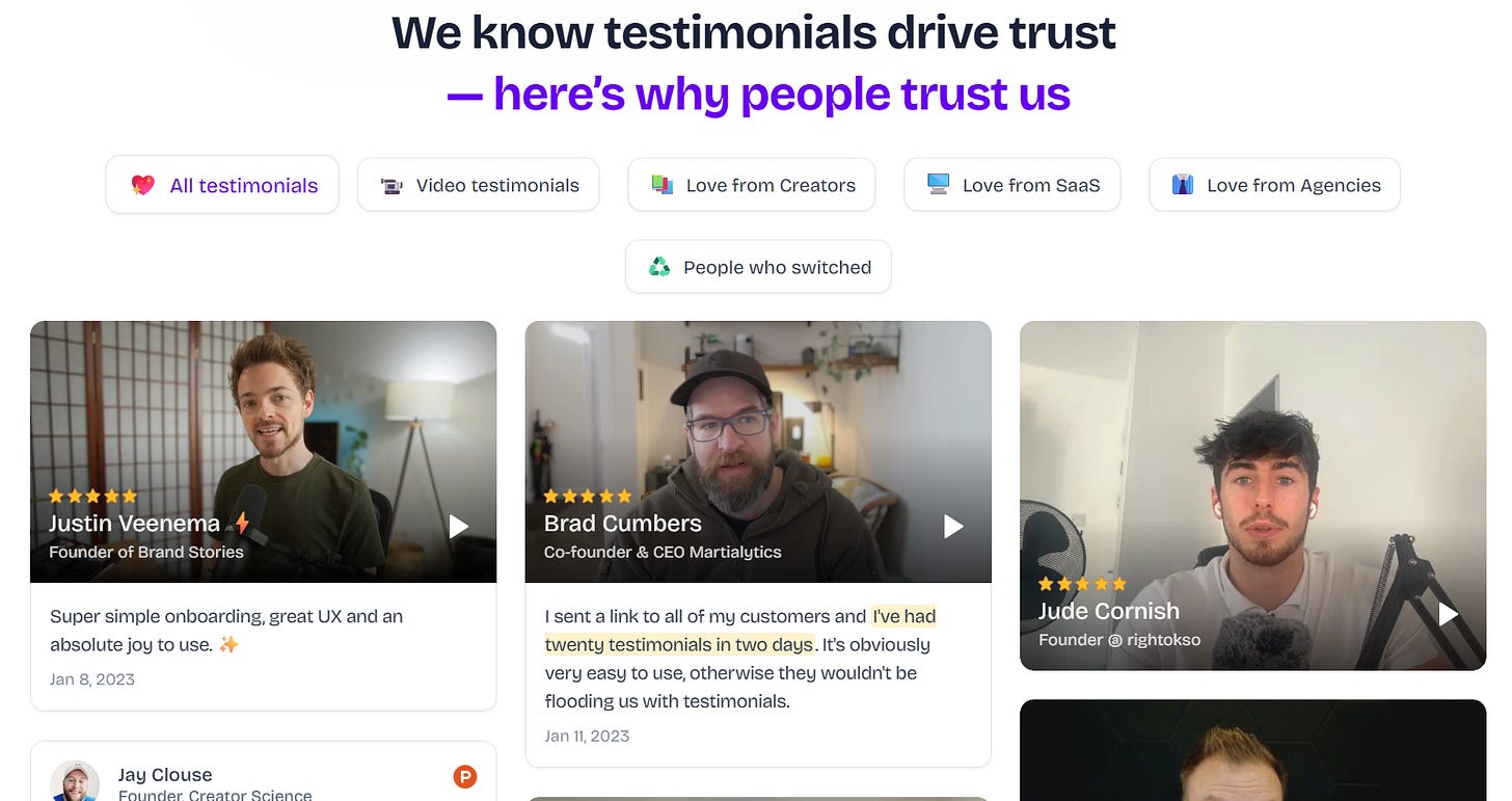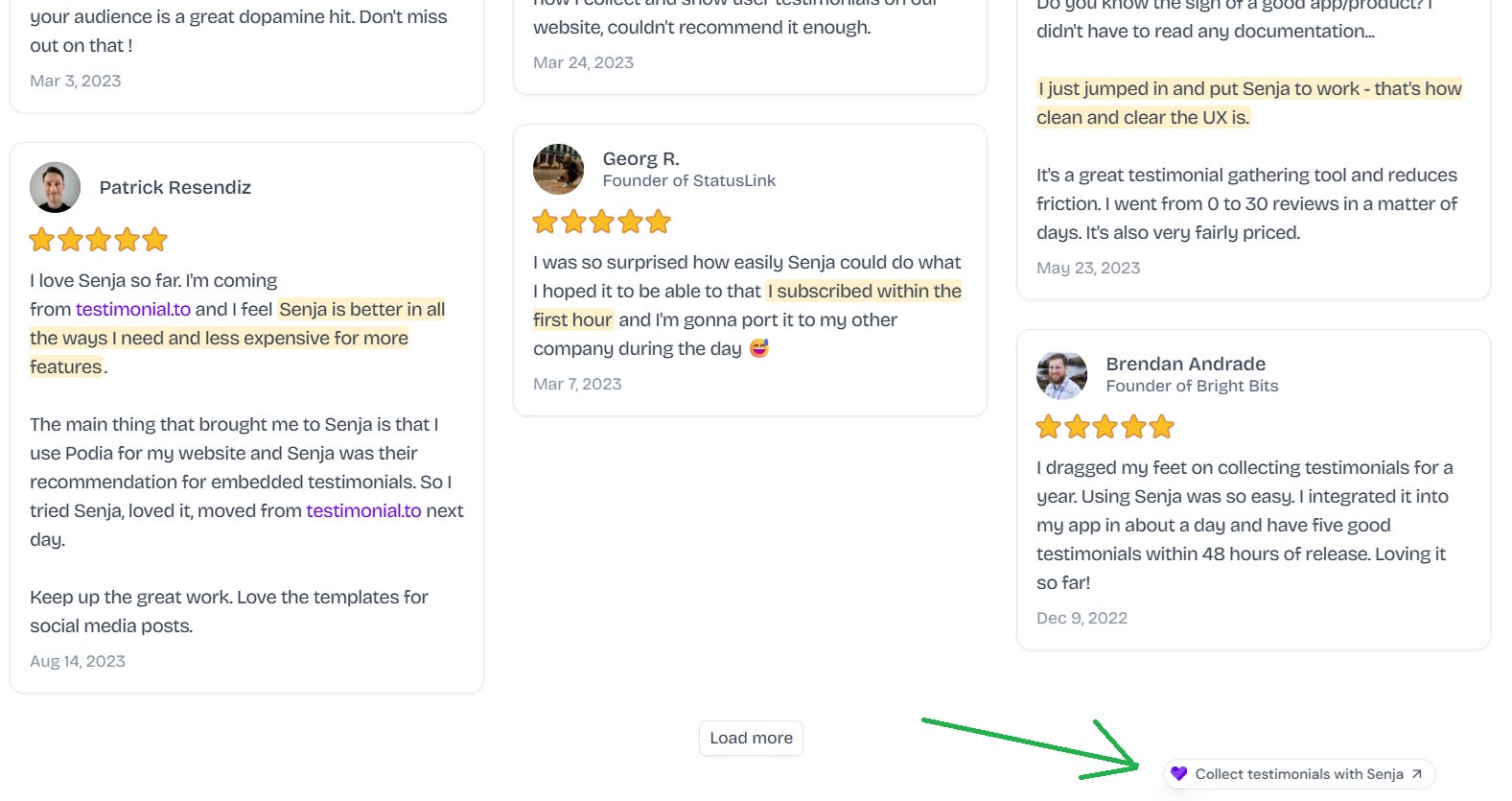 After scrolling down on their homepage you will start seeing a ton of testimonials displayed in a grid. Scroll down some more and you will see the Senja badge, proudly showing that Senja use their own product on their homepage.