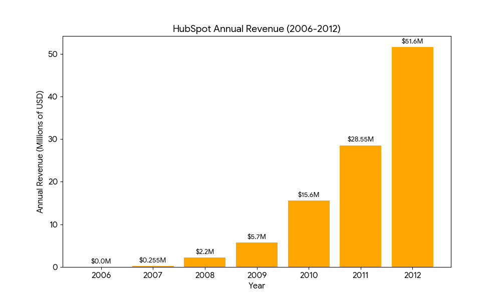 The concept of inbound marketing spread online like a wildfire which helped HubSpotâs revenue grow to over $50M within less than 7 years.