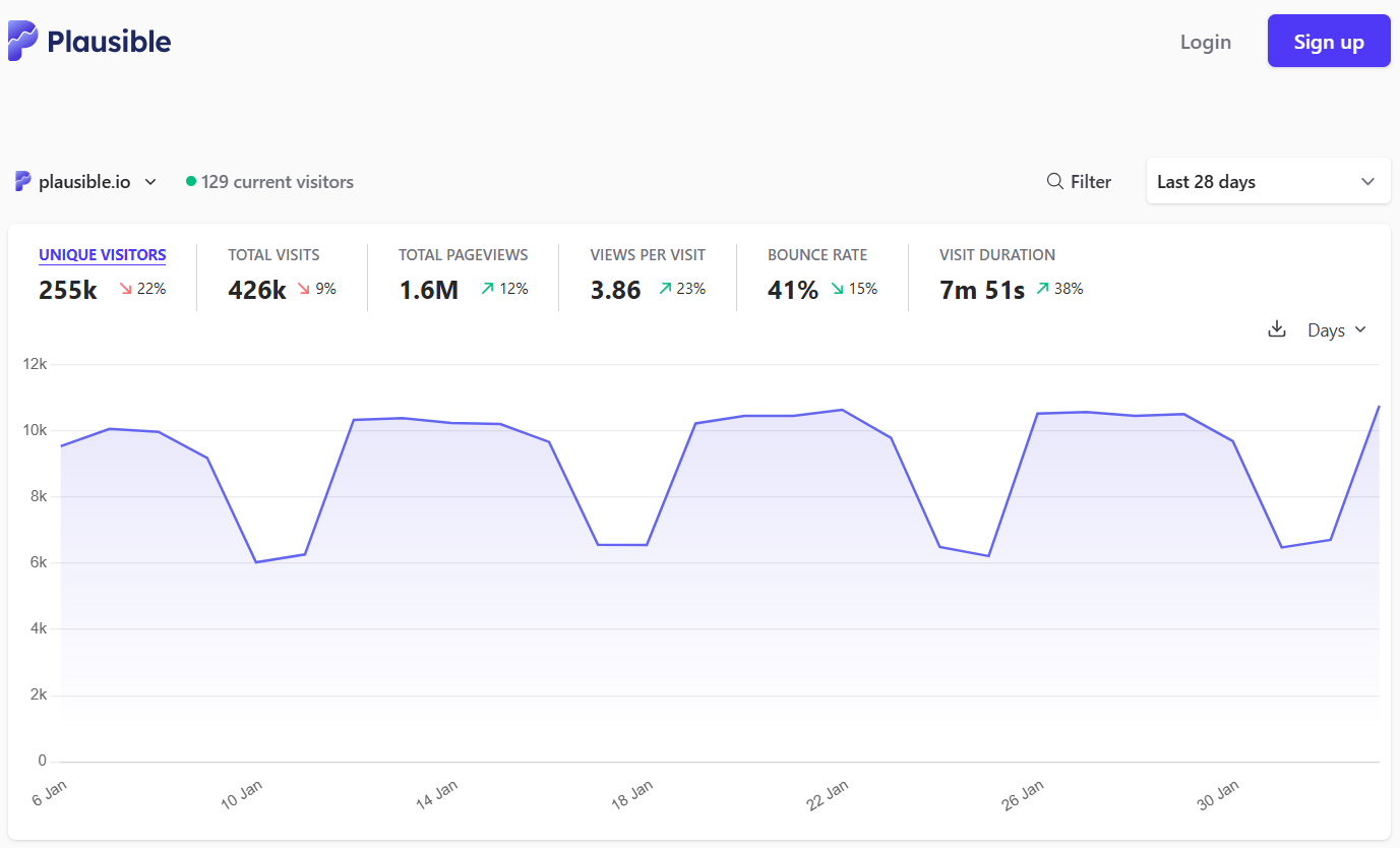 Plausible is a Google Analytics alternative that uses their own product to track their web analytics.