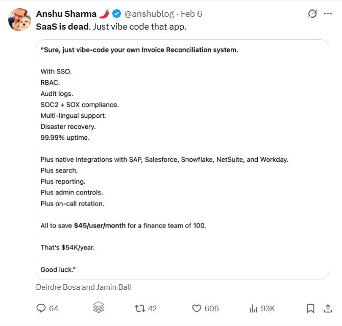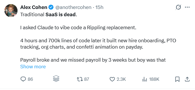 Some businesses will end up vibe coding replacements for certain SaaS with cheaper self-built solutions.