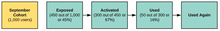 So lets say that out of the 450 users which saw the feature, 300 of them activated the feature. We can now say that your exposure to activated rate is 67% (300 / 450) and your activation rate for the September cohort is 30% (300 / 1000).