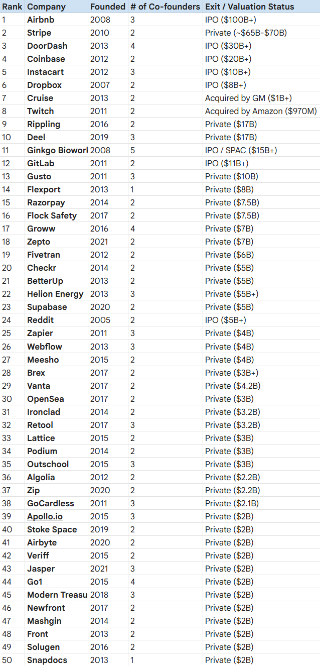 The table below shows the top 50 Y Combinator startups ranked by exit amount or estimated valuation. Only 2 in the list have a solo founder.